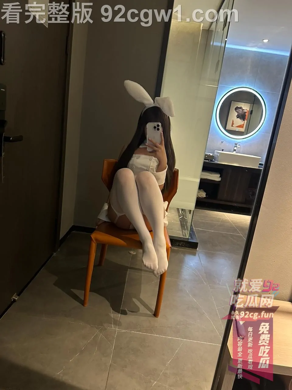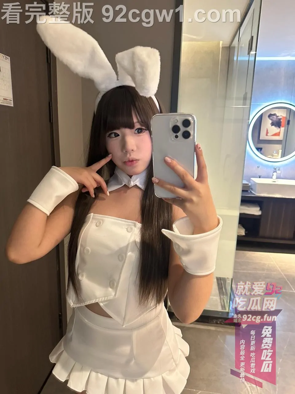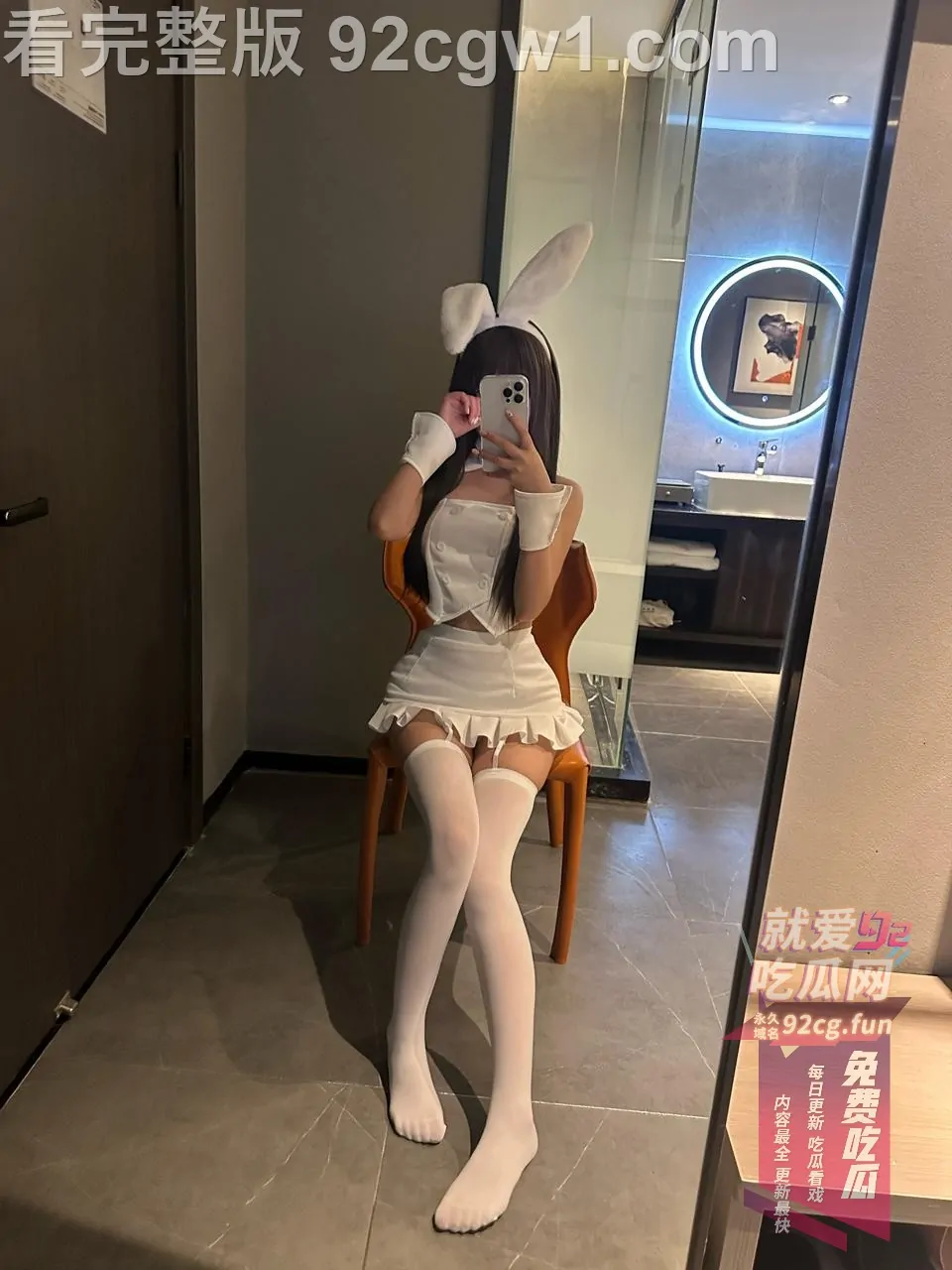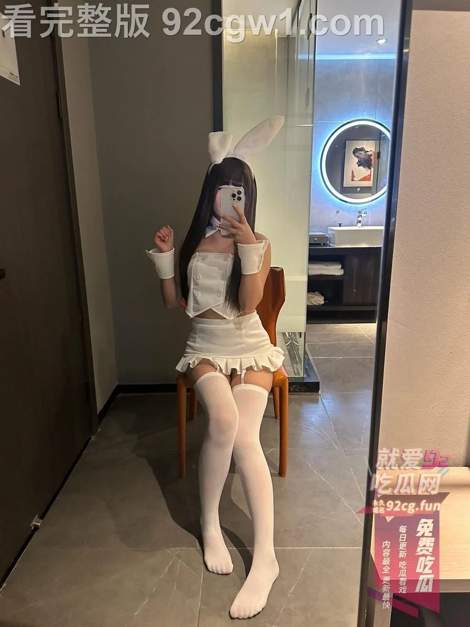 她戴着软萌兔耳,雪白吊带兔女郎装只剩薄薄一截,坐在椅子上直接把双腿大张成M字。白丝吊带袜勒得大腿根泛红,裙摆整个掀起,露出刚剃得干干净净的白虎小穴,粉到发亮、毫无遮掩。她一手举着手机自拍,一手还故意把腿掰得更开,甜度与色度直接爆表!