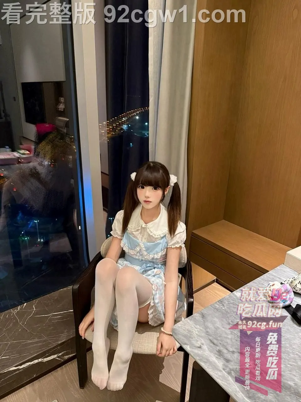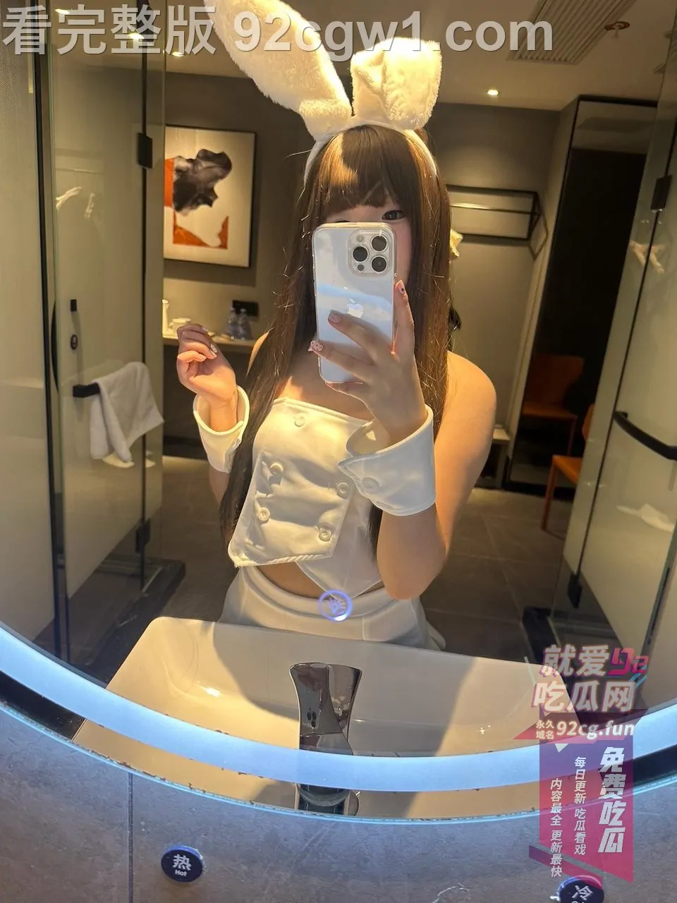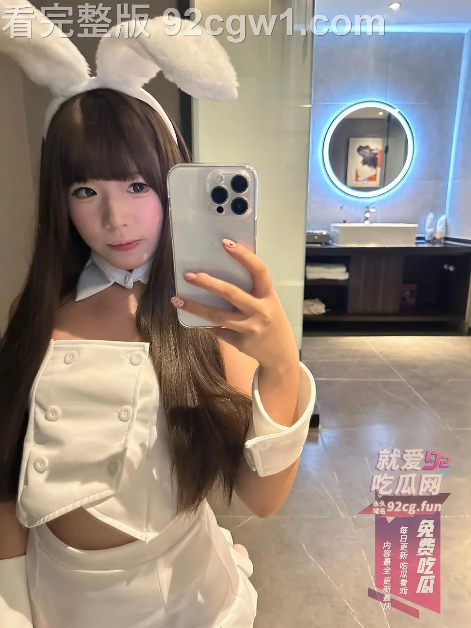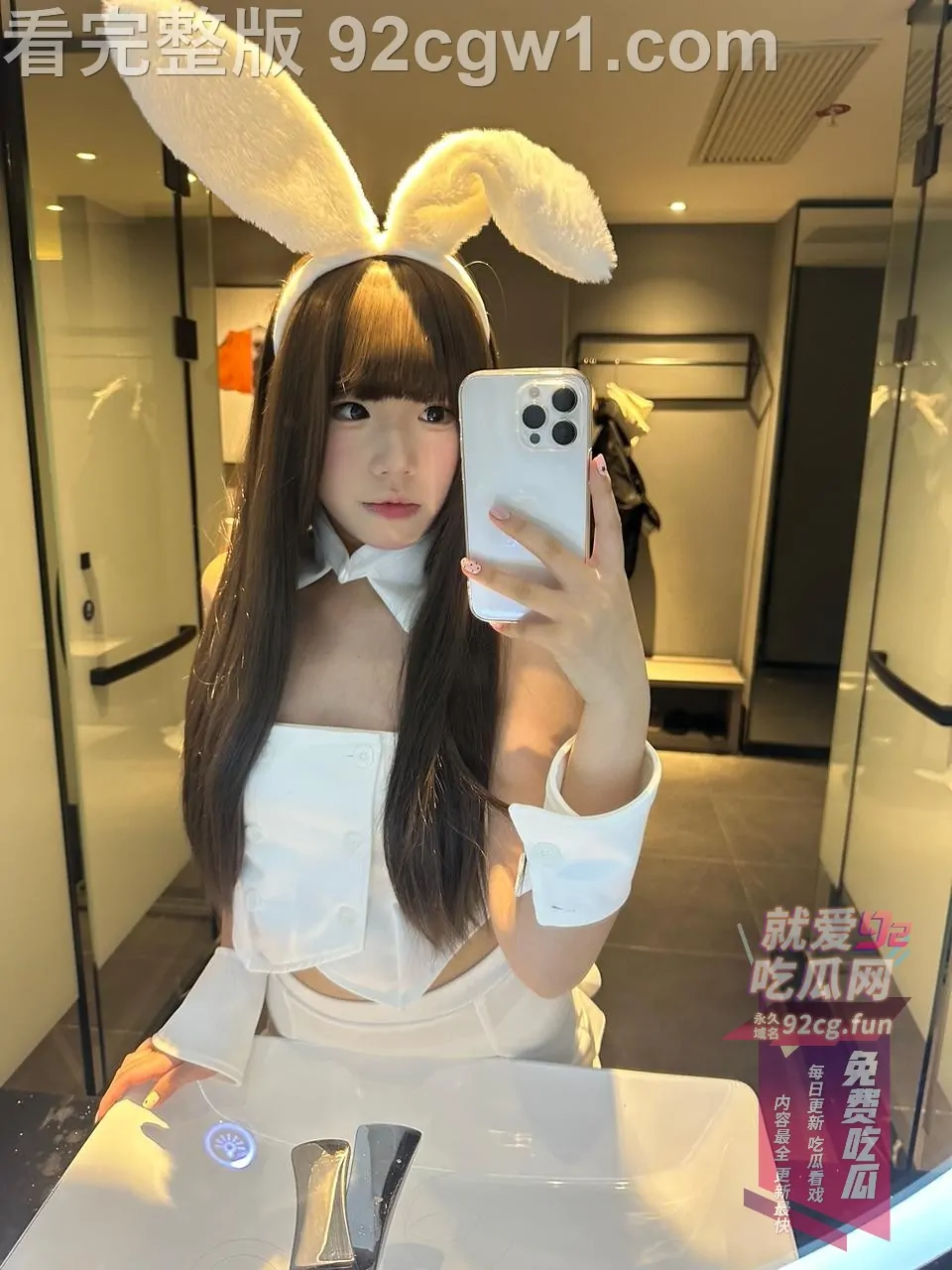 她戴着软萌兔耳,雪白吊带兔女郎装只剩薄薄一截,坐在椅子上直接把双腿大张成M字。白丝吊带袜勒得大腿根泛红,裙摆整个掀起,露出刚剃得干干净净的白虎小穴,粉到发亮、毫无遮掩。她一手举着手机自拍,一手还故意把腿掰得更开,甜度与色度直接爆表!
